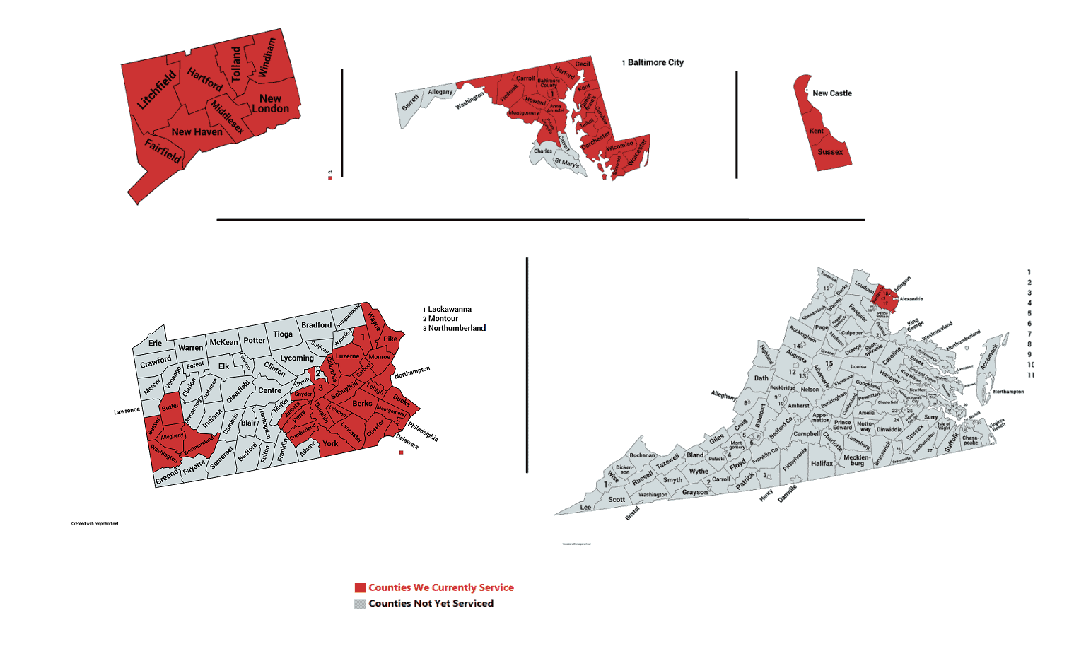 Our coverage range fully covers all of the following Pennsylvania counties: Berks County, Bucks County, Chester County, Dauphin County, Delaware County, Lancaster County, Lebanon County, Lehigh County, Montgomery County, Northampton County, Philadelphia County, and York County.